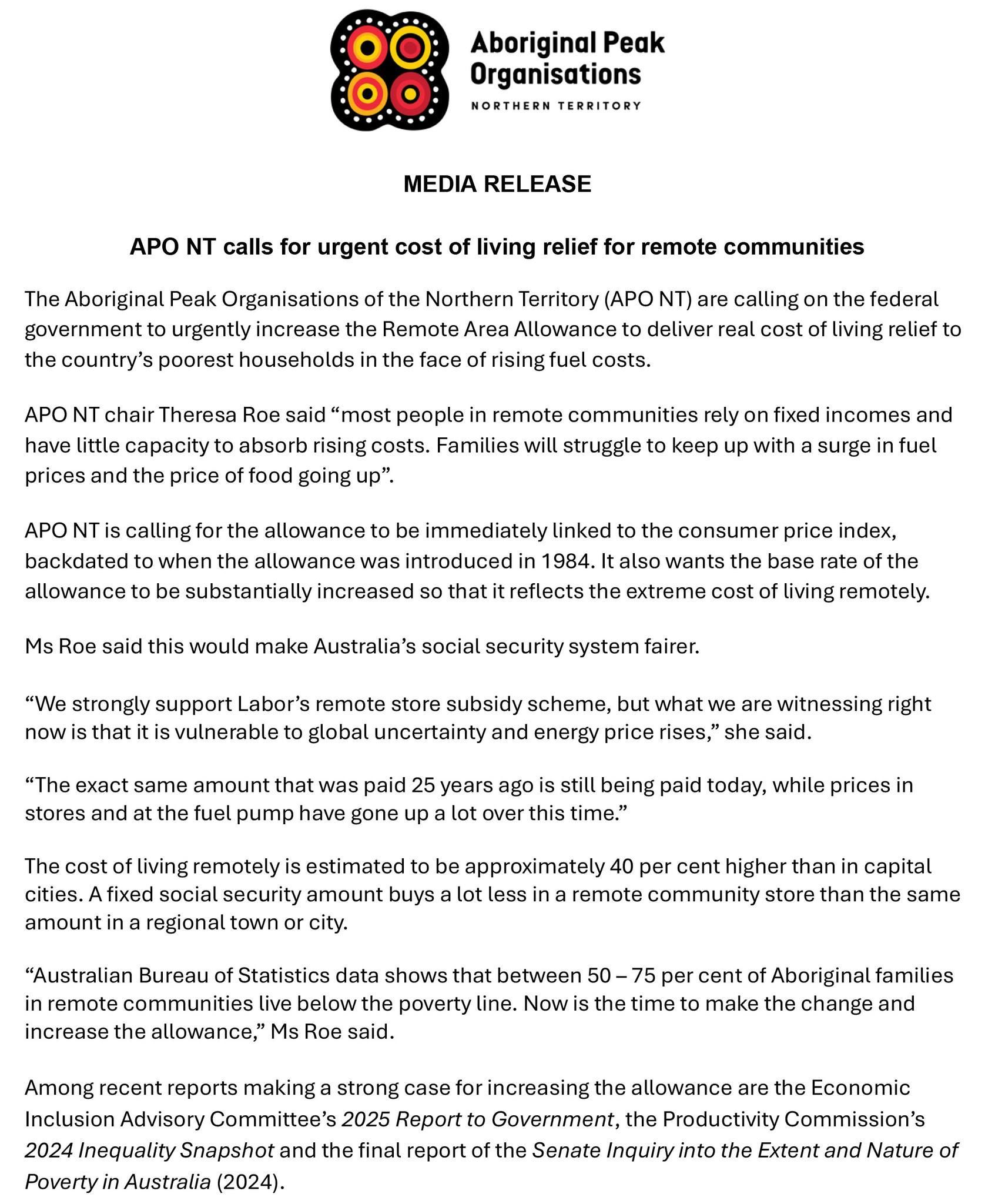 As a member of the Aboriginal Peak Organisations Northern Territory, the Northern Land Council supports calls for an urgent increase in the Remote Area Allowance to deliver cost of living relief to the country's poorest households.